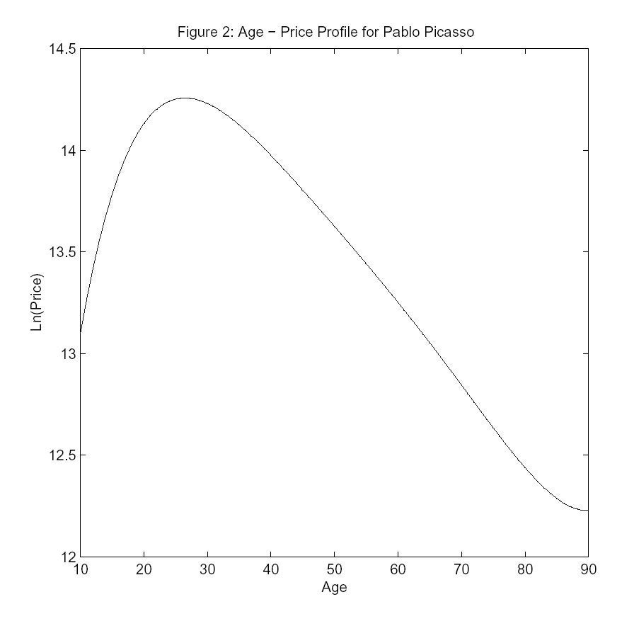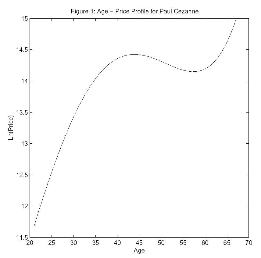Galenson arrived at his theory by asking a somewhat naive question: what’s the relationship between price of painting and age in famous painters? After taking a sample of 400 painters and looking at the prices of their work and age, he found two clusters, best exemplified by Paul Cezanne and Pablo Picasso. Galenson called the artists in the Picasso cluster the “Young Geniuses” and the Cezanne cluster the “Old Masters.” Young Geniuses make their best artwork very early in their careers, while the Old Masters have steadily increasing prices till they hit a peak in their old age.